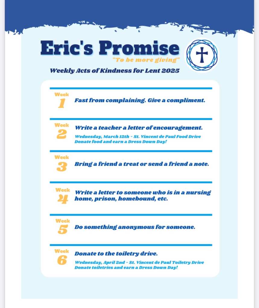In 2011 Eric’s Promise was the most successful drive in the history of St. Vincent de Paul Society of St. Joseph County, Indiana. Let’s take this and multiply it! Let’s help whatever organizations draw us closer to love in this same Spirit. That is the point. Eric’s Promise is to be more giving, not lie so much and do more random acts of kindness. It is not limited.