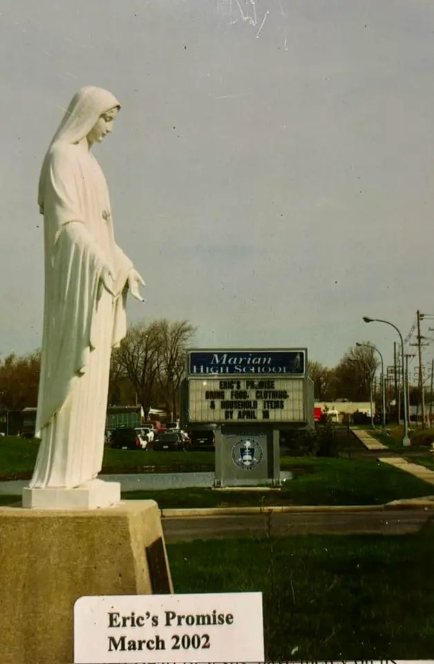 Eric was a Senior at Marian High School when he died suddenly in a single car accident on Valentine’s Day 2002. The night before he died (Ash Wednesday), my Mom was with him, sitting on his bed watching him clean his room. This was the night that Eric expressed his heart to my Mom, about his life change, which was spurned by Lent 2002.